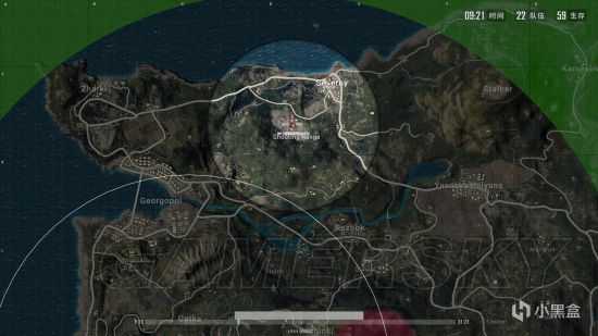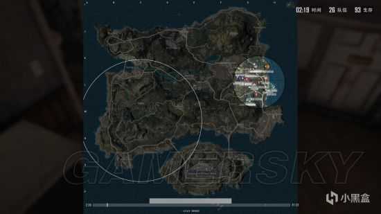 经过一轮快速的搜索过后,第一个圈的位置也刷了出来,是一个左边陆地圈,我们不在圈内,就开车绕到圣山边进圈,以免在转移过程中被打。