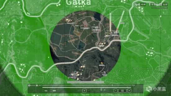 第四个圈刷新过后我们的位置已经很靠近圈边了,因为我们在这里待了很久,四周观察发现圈外几乎没有人,所以我们选择从房区内出来压到平原上,这样观察的位置更多,能够收集到的信息更完全。