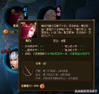 这个武将的厉害的很,特别是最后个技能闪杀,闪避高的时候几乎是对方每打你一下你都会反击别人一次,且对方还不加怒气,等会别人打不到你你却能反击别人把别人打到最后对方一个技能都放不出来。