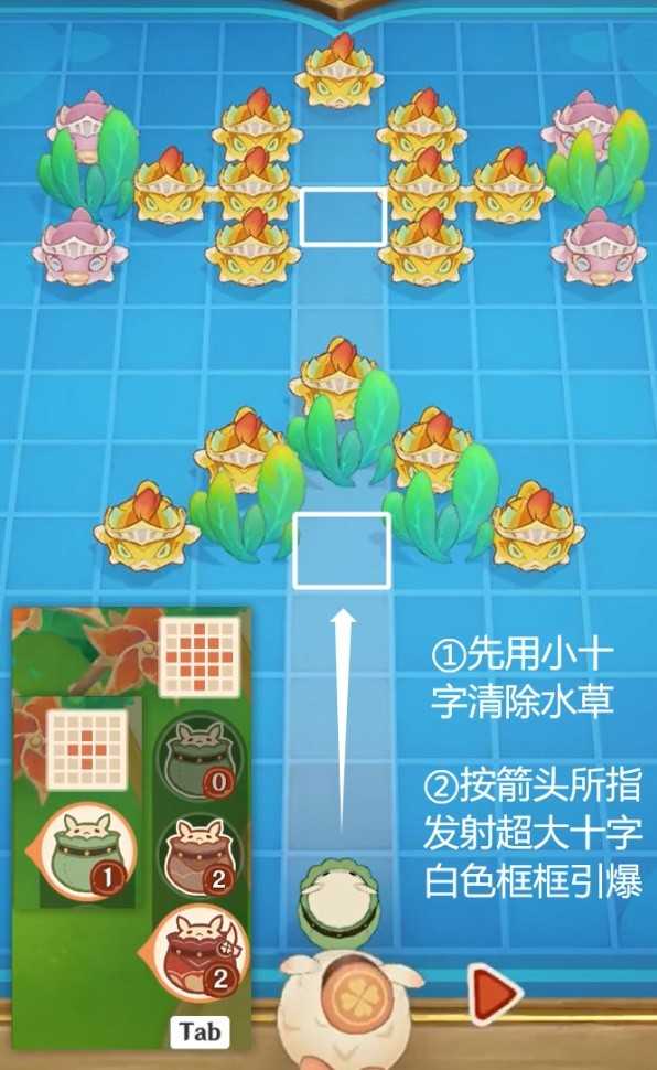 同样是从箭头所指的路径发射蹦蹦,首先要用十字范围蹦蹦清除水草