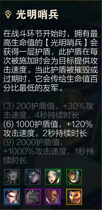 光明哨兵羁绊主要由奥拉夫、赛娜、刀妹、派克、洛、奥拉夫、卢锡安、阿克尚8个英雄组成,但是需要一个转职书才能凑出9光明哨兵,而光明哨兵转职只有在武器库、选秀以及野怪爆的纹章之书里出现,获取难度比之前大多了,因此不优先考虑9哨兵这种神仙羁绊。这套阵容玩法主要由6哨兵2亡魂羁绊组成,卢锡安作为哨兵的4费卡,当仁不让的成为主C。而新加入的奥拉夫作为一张骑士卡牌,它的坦度足够撑起这套阵容的前排。等等,大家有没有哨兵阵容有点似曾相识。这套阵容相当于圣光大眼仔的翻版,大眼仔属于魔法伤害,而哨兵卢锡安则属于物理伤害,加里奥跟芮尔差不多主打前排的坦度,然后搭配的都是6羁绊属性,不能说一模一样,但是基本毫无差别了。简单来说,如果你在S5赛季对于大眼仔阵容非常熟悉,那么这套阵容对于你来说就是非常容易上手。