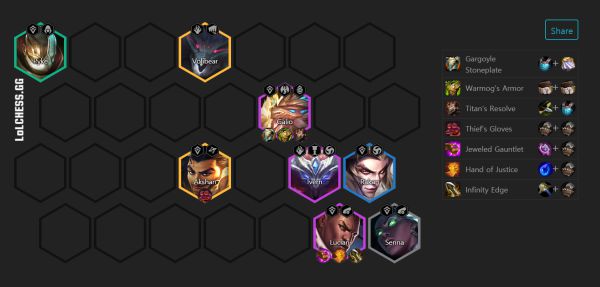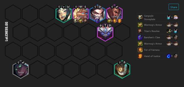 阵容推荐:赛娜、派克、洛、加里奥、艾翁、卢锡安、狗熊、阿克尚阵容羁绊:6光明哨兵2神谕2亡魂2枪手