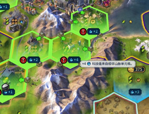 我们主要看相邻加成,就是山脉,雨林,区域单元格。什么意思呢?就是说只要你的学院附近山多,雨林多,再被包围起来,那么学院基础产出的科技值就更高!越利于科技升级!