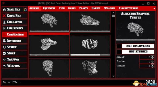 这一栏有一排修改:动物击杀数据,后面是其他数据类修改,后面还有特殊道具解锁,传说动物饰品解锁,香烟牌子修改等。