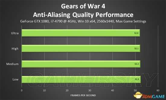 战争机器4没有和其他游戏一样选择MSAA,FXAA等常见的抗锯齿,而是使用了Temporal Anti-Aliasing(TAA),从截图的效果来看low和ultra并没有太明显的差异,性能影响也非常小。