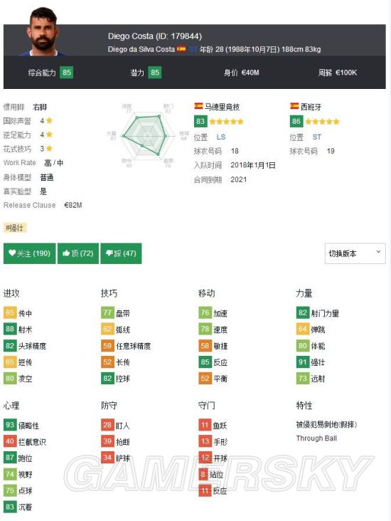 现年29岁的迭戈-科斯塔正值巅峰,有着91点的强壮,76、78点的双速,运动能力出众、进攻意识极强的他极富冲击力。即使技术欠佳,但凭着高达88点的精湛射术和82点的头球能力,迭戈-科斯塔依然是众多后卫的噩梦。游戏中的迭戈-科斯塔能抗能射,也相当实用。