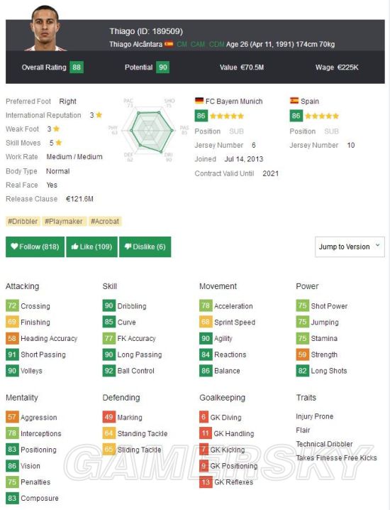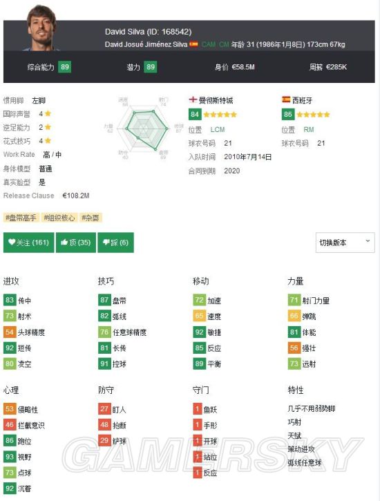 大卫-席尔瓦不仅技术突出、而且同样低身高的特点也让他的敏捷和平衡达到了92点、89点。同样是矮个子,他与伊斯科的球风却不尽相同,大卫-席尔瓦喜欢持球后的调度组织和传球进攻,而不是拿球突破,这是更倾向于核心位置的踢法,从他92点的短传便可见一斑。不仅如此,大卫-席尔瓦的传球也极富创造力,常常能在出其不意间造成相当大的威胁。
