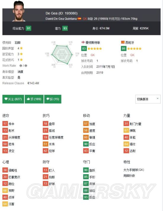 总评达到90点高分的门将,高达93点的极快反应和90点的鱼跃是他赖以成名的绝技,而且手脚并用的特性更是极具代表性。在卡西渐渐淡出国家队主力后,德赫亚成为了这支西班牙队最信赖的最后一道屏障。在游戏中德赫亚不仅有很好的模型,而且扑救时极快的反应速度和卡片本身超高的数值能力都让不少玩家都梦寐以求。
