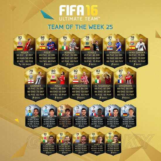《FIFA 16》每周官方都会根据当周现实比赛的球员表现评选出每周的最佳阵容,那么下面小编就为大家带来《FIFA 16》第25周最佳阵容,由打破皇马球门的马德里竞技队法国巨星格列兹曼领衔,包括了诺伊尔、皮克等大牌球星,一起来看看吧!
