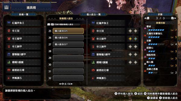 配装多数用这套,护石痛2s2,属性武器就把一级洞换成属攻,打霸青跟钢龙我会出个回距一,Ko术像是打霞龙这种比较难打头的就不会出。