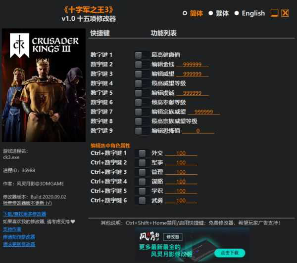 简体、繁体、English,可以切换语言 (切换语言后修改器将把该语言设置为默认语言)