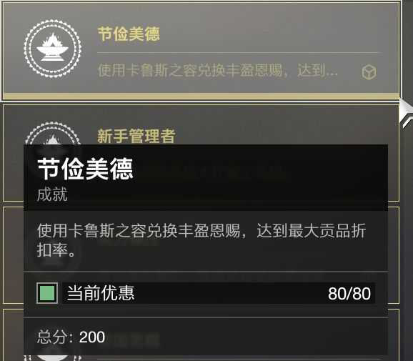 这个成就推荐大家每天上线之后飞一趟贡品大厅,看看每天的四个悬赏里面有没有比较容易的(不死用武器击杀和目的地击杀是比较好完成的),每天做几个,80%的折扣就会向你招手的qwq