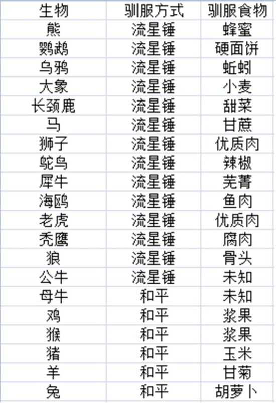 流星锤驯服法:必须将动物的血量降低至10%,然后流星锤才能用于动物。当动物被流星锤捆住时,他们将被击倒在地。需要接近动物的头部并喂它是最喜欢的食物。最好从后面接近动物以喂它。用流星锤重复破坏和诱捕,然后喂食,直到动物的驯服条满了,动物就会被驯服。