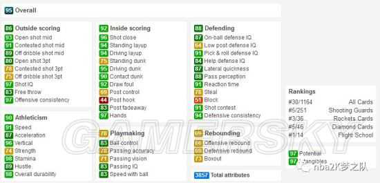 这张钻卡的总分为3857点,其中扣篮属性为:突扣95+隔扣90+弹跳96+双倾向100,大家可以体验一把空中滑翔的感觉。此外,他也有着不错的中投能力(93),热区也是内线全都覆盖(如下图),但德雷克斯勒的三分比较一般(空三80),如果你想长时间使用他的话,最好能配上一双加三分的钻鞋。