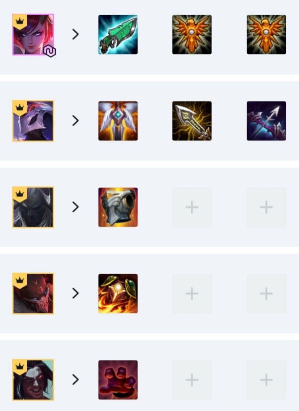 装备方面瑟提主要吃法强装或者肉装,有科技刀最佳;其次沙皇吃团队辅助装,例如基克、鸟盾之类的;EZ吃物理装主要当ADC和群体BUFF的功能;凯隐吃法强装补充瑟提打残的伤害+收割;永恩只要吃肉装能够多放出两次大招就赚了。