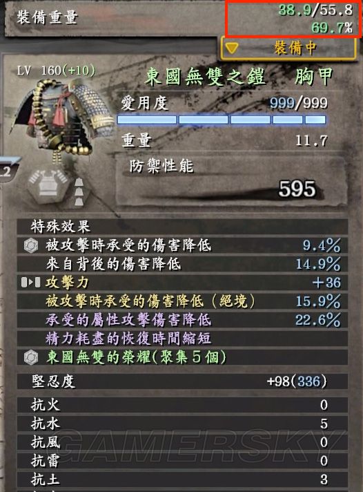 配装方式是4东国3剑豪,达到了5件大铠的配置。蜻蛉切的面板达到了惊人的2054。如图负重正好控制在70%以内。