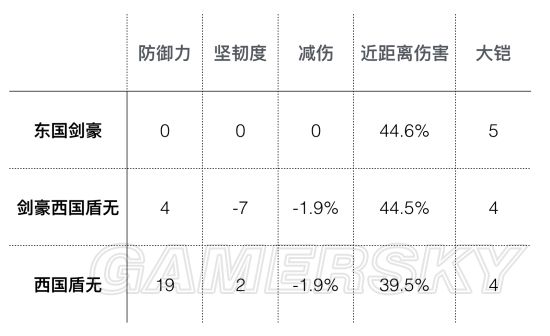比方说如果东国剑豪的坚韧度是0,剑豪西国的坚韧度则是-7(说明剑豪西国比东国套低7点坚韧),其他数值同理。