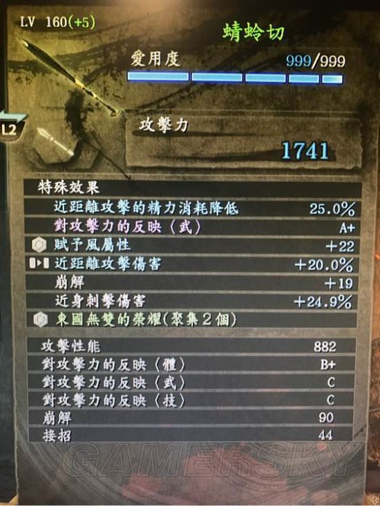 面板上,蜻蛉切白字,崩解,接招均高于鬼左近。还有满风22。上Buff速度比鬼左近快22%。相当于多一个22%的属性增伤词条。另外东国多送了一个30%的刺击伤害(无双富岳)。
