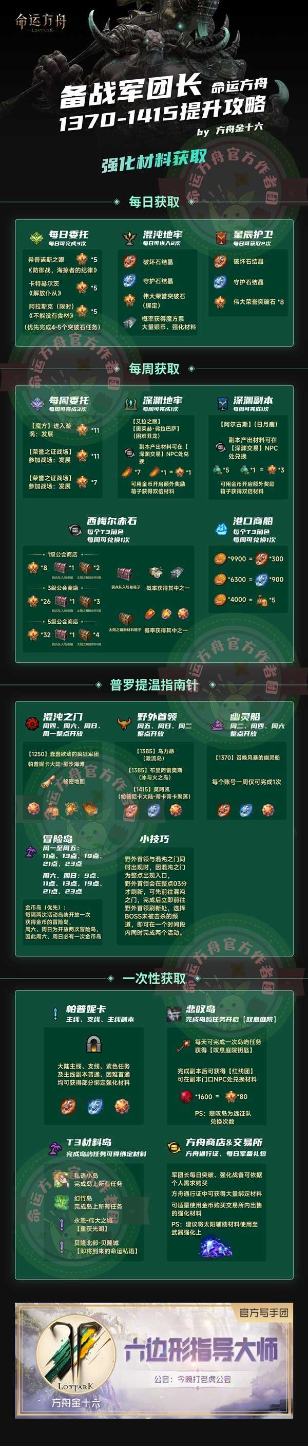 《命运方舟》军团战版本即将到来,我们提升到1415装等中有什么需要获取的零件呢?下面请看玩家“金十六”带来的《命运方舟》1370-1415全强化材料获取攻略,希望能帮助到大家。
