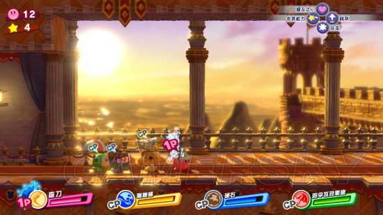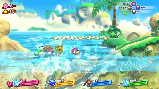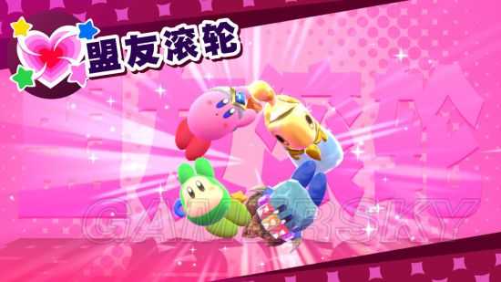 队友的存在不仅仅是角色数量的提升,而且还能通过能力融合创造出全新的角色形态,比如剑士卡比的宝剑可以被火焰能力的伙伴赋予火焰的特性,变成全新的“火焰剑士”形态;石头卡比被赋予冰的力量,则变成冰壶形态。游戏中提供了很多脑洞大开的合体能力,只要有相关能力的队友在队伍中,按住方向键“上”即可融合变身,非常有趣。