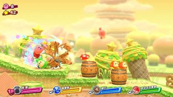 画面虽然变成了3D,但最适合卡比的操作类型仍然是2D横版过关。在这次的《新星同盟》中,伙伴设定在游戏中占到了相当大的份量,除了卡比自己吞吃敌人变身之外,还可以通过抛出盟友之心来将敌人变成自己的同伴,队伍上限为4名角色。玩家一个人游玩时,这些伙伴会由AI控制,但如果有志同道合的好友和多余的手柄,本作也支持最大4人同屏游戏,充分阐释了游戏名称中“同盟”的意义。