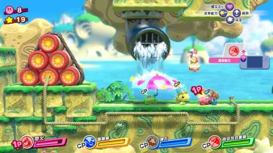 冒险途中,还会出现利用多种能力来解开的谜题,冰能力能冻住倾泻而下的水流,而雨伞能力则能遮挡水。从Demo中,我们已经可以一窥变身解谜的乐趣,正式版的丰富度可想而知。不止如此,《新星同盟》中不同能力形态下的可用动作也有所提升,一种形态至多能使用超过10种的特殊动作。在卡比系列中,“发现”的乐趣一直在被强调,这种源于好奇心的乐趣便是游戏能带来的最为出色的反馈之一。
