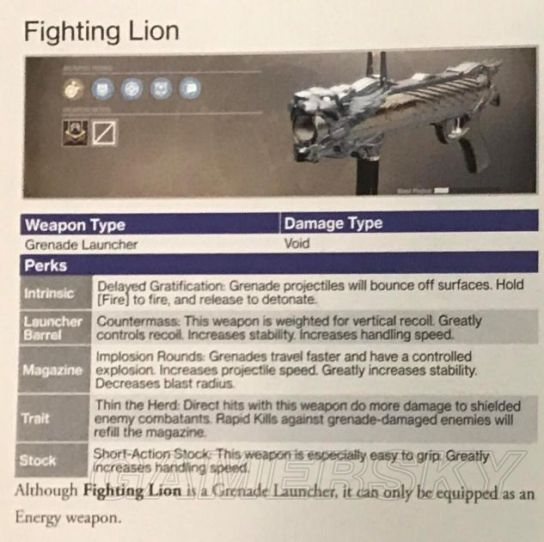 特殊搭配:Fighting Lion狮头牌榴弹发射器是唯一的装备在能量武器位置适用绿子弹的榴弹发射器,其他的榴弹发射器都是用紫色子弹的高能武器。