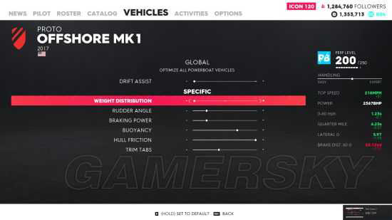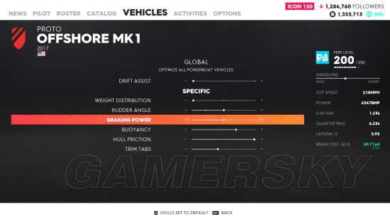 制动力,往右调增加往左调降低,对船来说很没用,船怎么样都要按住油门,而且目前所有船赛事中(包括Jet Sprint)还没有哪一个是需要靠制动来减速的,所以可以不管这一项