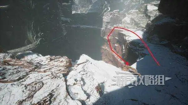 从第三回【小西天-浮屠界-经筒外】土地庙往BOSS【魔将·妙音】所在位置的桥走,到悬崖边右转可以看到前方岩壁上凸出了一些大石头,这些石头是可以踩着往下跳的。沿着石头往下跳,按照下图箭头方向前进。