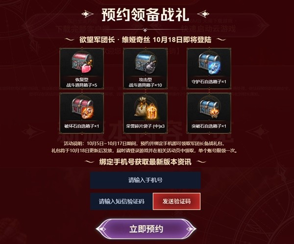 维娅奇丝首次在军团长副本登场,给冒险家们准备的备战礼包也十分丰富,在10月5日-10月17日期间,冒险家前往官网预约备战礼,预约并绑定手机即可获得军团长备战礼包,礼包内包含【恢复型战斗道具箱子】*5、【攻击型战斗道具箱子】*10、【守护石自选箱子】*1、【破坏石自选箱子】*1、【荣誉碎片袋子(中)】*3、【突破石自选箱子】*1等道具,单个账号限领一次。