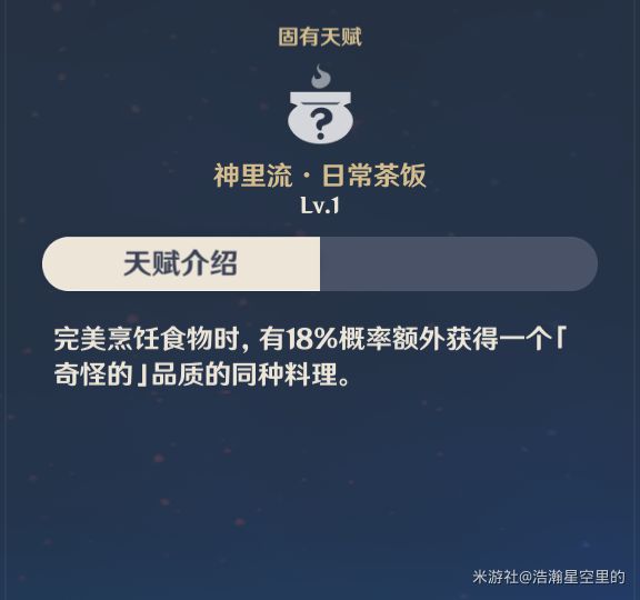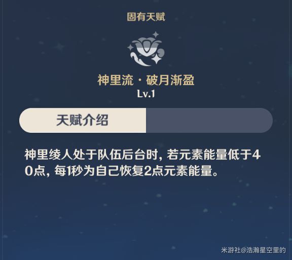 增加绫人大招的回能效果。每秒恢复2点元素能量,不过仅在40能量以下、且角色处于后台时生效。绫人自身开E后的6秒站场时间就能恢复10-20点元素能量,所以该天赋其实能带来的回能是有限的。