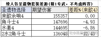 绫人的圣遗物套装,综合下来也就3个选择:新圣遗物来歆余响、角斗士套、水套。3种套装的伤害差距并不大,以精1专武为例,带三种圣遗物的期望对比如下