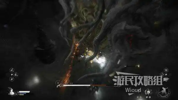开局先在门口原地蓄力二棍势,然后进入BOSS房触发战斗,蓄力完成走到BOSS左前方视角往右对着头部的铁球来一个重击,这样不仅能输出一波伤害,还能躲避一波射线攻击,看到妙音倒地趁机对着铁球再输出一套普攻。