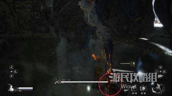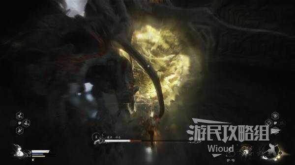 然后一直对着敌人发光的右前脚打普攻,这段时间也没有强力的攻击需要躲避,等待妙音吼出来屏幕变白,这时玩家的攻击力大幅度提升,继续普攻用连招的最后一棍把妙音打出破防。