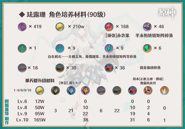 3.珐露珊的辅助能力更多依靠元素爆发来启动,但其需要80点能量启动,因此需要多堆叠充能效率,其充能需求主要是6命和非6命,非6命时推荐在240%+、6命时可在210%左右。