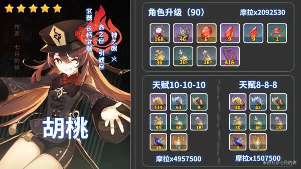 胡桃是一个火系天花板级的爆发输出角色,等级天赋突破素材需要霓裳花、魔王之刃 · 残片、未熟之玉、燃愿玛瑙系列、花蜜系列、勤劳系列。