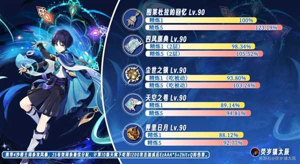 看得出来,在获得攻击力加成之后,部分武器的期望排名有了提升,四风原典来到了第二名。因此在武器的最终选择当中,我们推荐专武>四风原典>尘世之锁>天空之卷>匣里日月。
