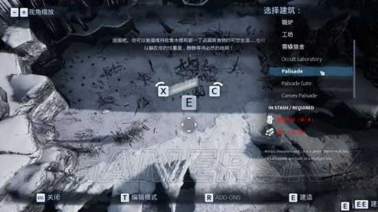 建筑工作非常简单,你只需要选好你要建造的建筑物,然后选好地址,地址上不得有其他杂物(哪怕是场景中本来已有的残垣断壁及断木),然后玩家就可以按X键和C键调整建筑物的朝向,然后按E键确认建造。