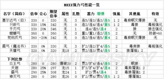 重射弓这里不列出(其实是不会用)MHX里碾压级的炎王和天廻包团痛哭,只眼成了最后赢家,强力的几把连射弓水平相差不是很大,起码不到mhx里炎王弓碾压的程度了。