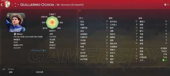 32岁的老门将,扑救能力惊人,反应17,一对一16,镇定17,虽然32岁了,身体保持的还非常不错,爆发力13,灵活居然有17,虽然能力不是墨西哥门将中最高的,但他在多次大赛上作为主力门将把守大门,经验上要远胜其他门将。