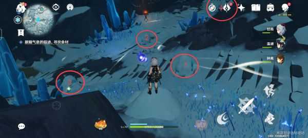 4.圈内是冰块,用火属性人物技能融化后站上去触发机关,触发顺序为1-2-3-4。
