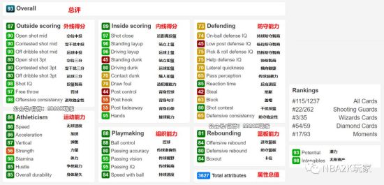今年的比尔钻时刻来的好像比去年晚一些,这张卡的属性总值给到了3627,六大项中唯一的一项黄区是防守能力,其余五项均落在了绿区。