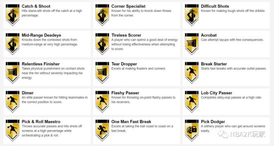 标配15枚金徽章,可以补上远距离神射、射程无限、持球防守和脚踝终结者。