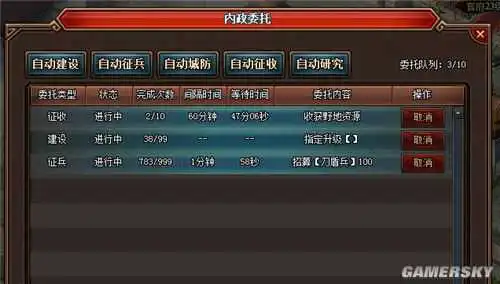 在《热血三国3》中,玩家可通过自动委托进行建筑升级、科技升级、征兵,从而快速累积出大量的兵力。