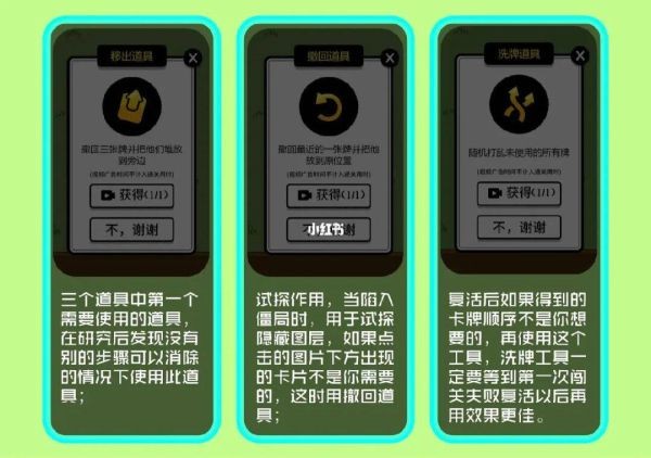 洗牌道具:复活后如果得到的卡牌顺序不是你想要的,再使用这个工具,洗牌工具一定要等到第一次闯关失败复活以后再用效果更佳。
