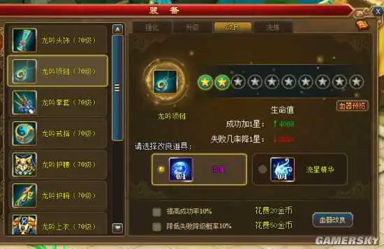 如果玩家担心在改良时降星,可选择花费20金币来提高改良10%的成功率,或是选择花费50金币来降低失败降级的10%概率。当然,如果你想极大的提升成功率的话,也可同时选择两种方式来预防改良失败降星的苦恼。