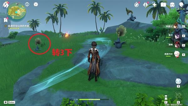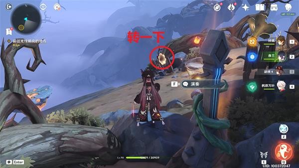 18.来到山顶后,将标记位置的音响转3下,使用树琴