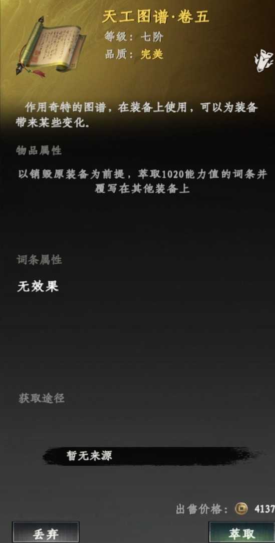 那么这就结束了吗?不不,你还可以通过下面这个道具:天工图谱,将你需要的单一词条(比如,第一张图片的功力词条)萃取出来,并覆写在你心仪的装备上,以上步骤反复操作,以达到7个强力词条被一件装备拥有的恐怖逆天效果。