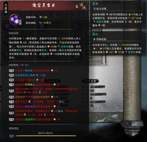 现在说一下逆天改命,筑基一定是要选剑灵,众所周知雷修单体伤害太差,所以剑灵是雷修的救命稻草;结晶又只能选风雷擎天,因为神通条件太苛刻(还没来得及触发小怪就死了啊);金丹有两个选择,一个是剑灵进阶,一个是灵能之雨,因为剑灵及其费蓝,基本一个副本就得睡一觉的那种,因为伤害提升一般所以可以考虑灵能之雨,当然继续强化伤害的剑灵进阶也是可行的;具灵的选择也是一样的,灵能之雨或者3级剑灵就再也不用蓝药了,之前选了灵能之雨这里就可以选择剑灵进阶;元婴的话已经选了3级剑灵其实就没有更好的提升了,黄巾拉怪、吸血续航都是可以的,如果选了2级剑灵,这里也可以选择2级灵能,低蓝的时候回60%并刷新技能,但是其实触发条件有点苛刻,不过特意去卡蓝量打高难度也是可以的,不过这个时候应该也没什么值得这么操作的地方了吧。