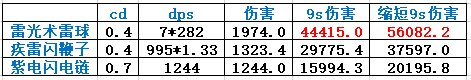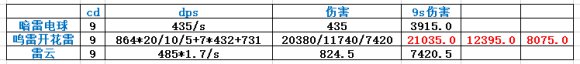 雷球满词条7颗小球,鞭子每次0.33的概率两鞭,暗雷电球词条有减33%灵技,所以这里也列出触发词条缩短的9s伤害,明显闪电链伤害不行,不再考虑。鸣雷开花雷单挑可以起手触发20个雷柱,分别计算全命中,命中一半以及1/4的情况;雷云有乱流增伤10%,计算起手身份叠7层。最后有如下组合: